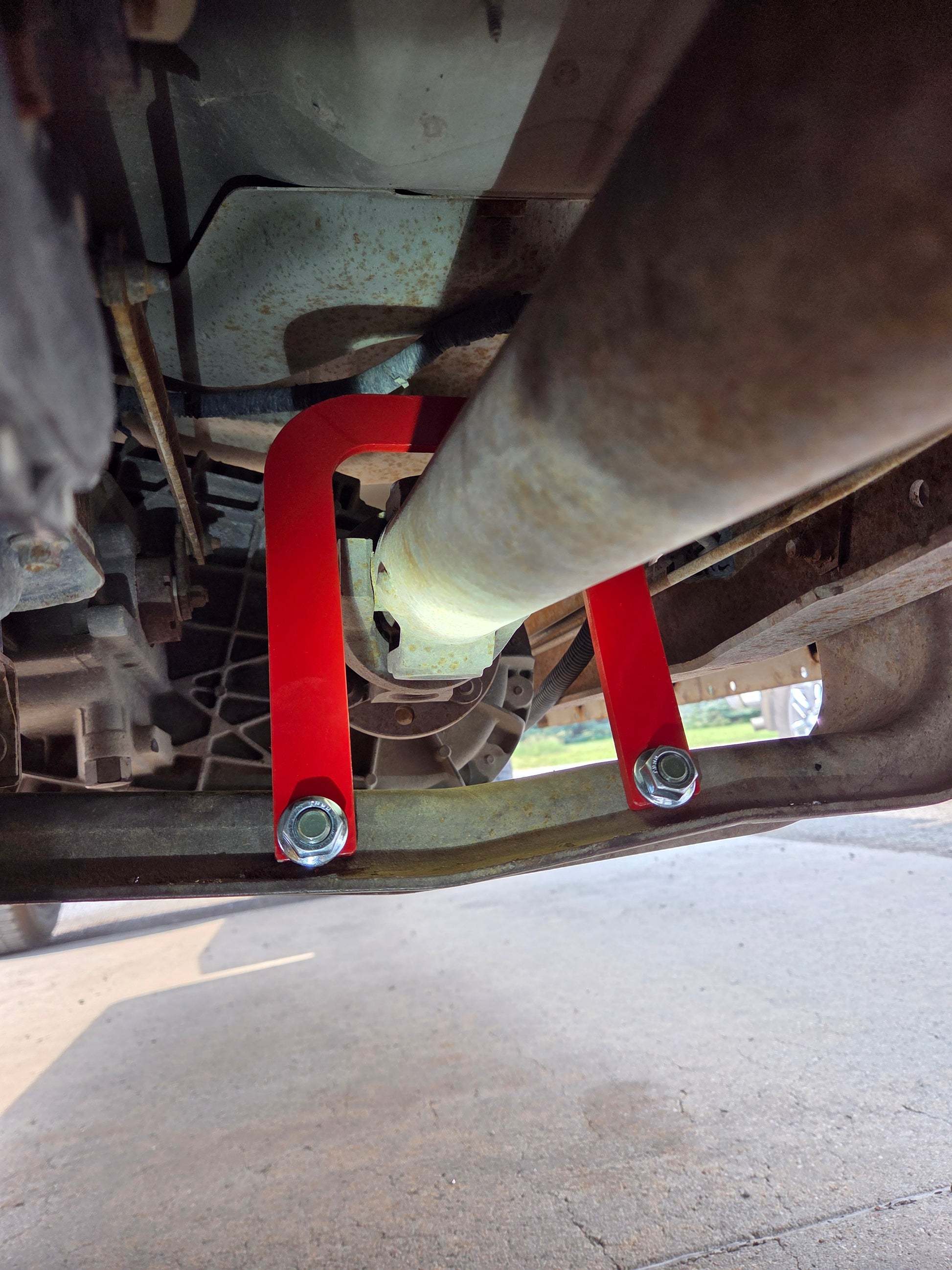 Requires drilling two 1/2 inch holes in the crossmember for mounting. Before drilling holes make sure the driveshaft is centered inside of the hoop.